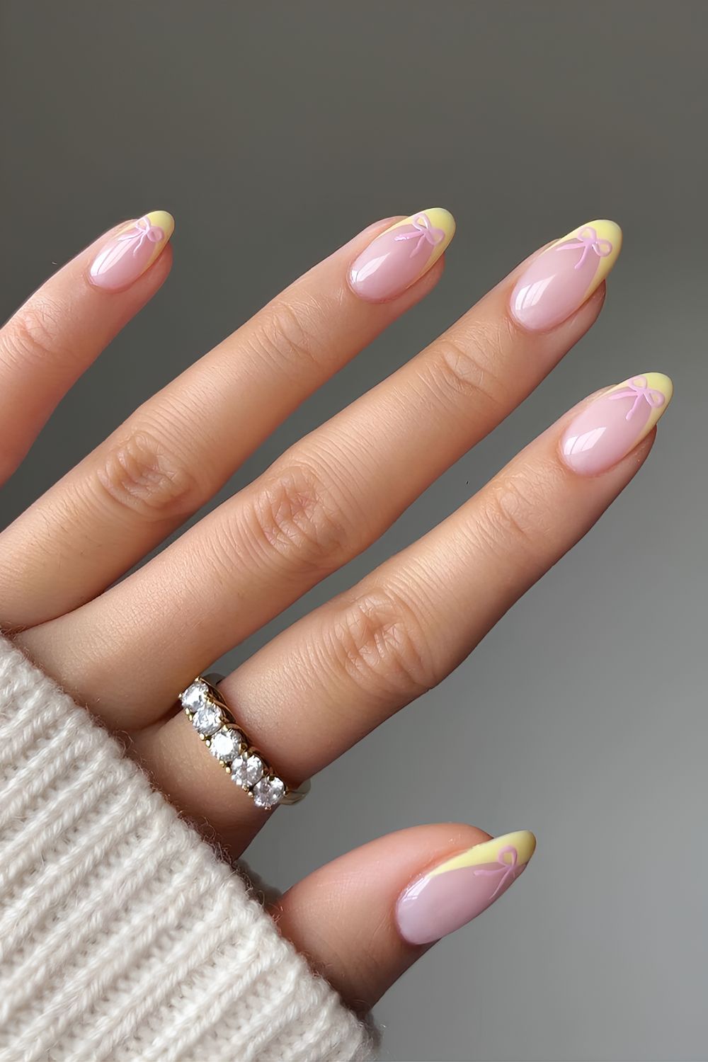 Handgezeichnete pinke Bows auf buttergelben French-Tips = girliest Mani ever. Zart, verspielt und trotzdem total on-trend.