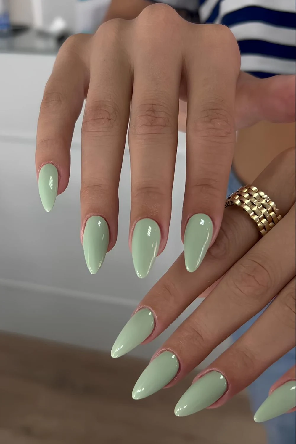 Der heißeste Frühlingsvibe? Pistazienbutter-Grün. Dieser gedeckte Farbton liefert große “Neutral mit einem Twist”-Energie – perfekt für die Saison. Weniger basic als Salbei, frischer als Mint – genau der dezente Farbakzent, den deine Nägel brauchen.
