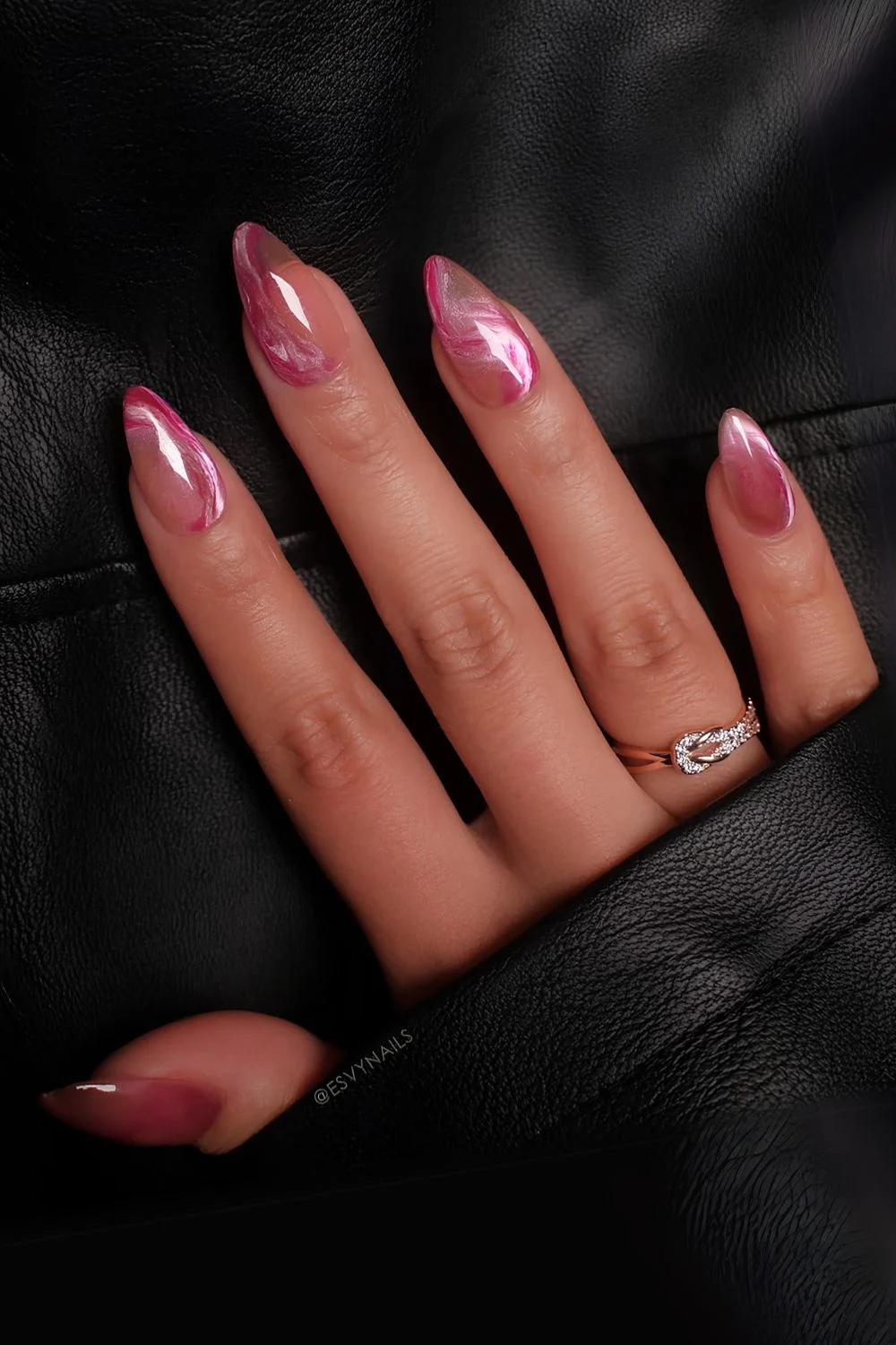 Cat-Eye-Marmor-Nägel sind einfach next level. Die schimmernden pink-weißen Swirls sehen aus wie flüssige Kunst direkt auf den Nägeln.