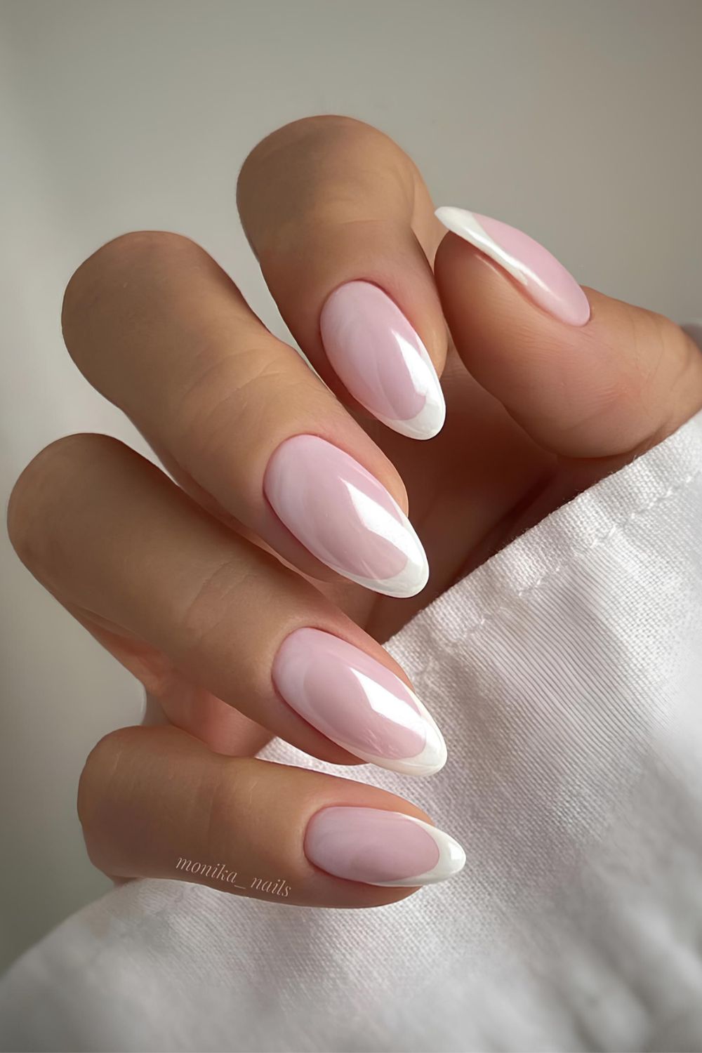 Mit feinem Nail-Art-Pinsel oder French-Guides eine hauchdünne, saubere weiße Linie setzen. Für eine Ombré-Variante die Spitze mit Schwämmchen oder sheer-weißem Lack leicht nach unten verblenden.